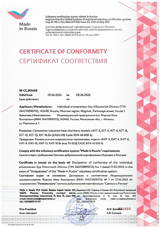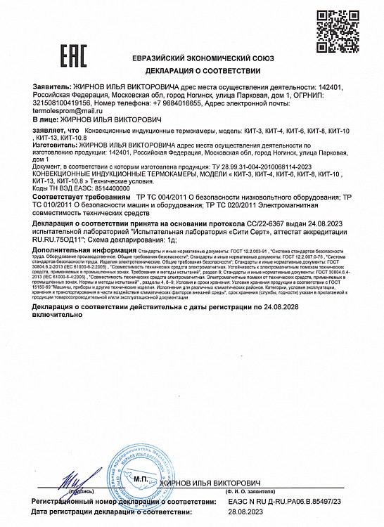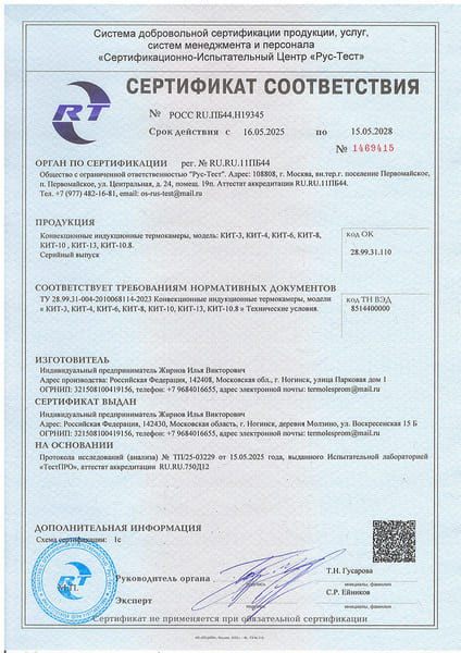 Convective induction thermocameras of models KIT-3, KIT-4, KIT-6, KIT-8, KIT-10, KIT-13, KIT-10.8 have passed certification and meet the requirements of technical regulations TR TS 004/2011, TR TS 010/2011 and TR TS 020/2011.